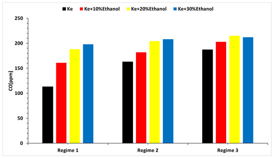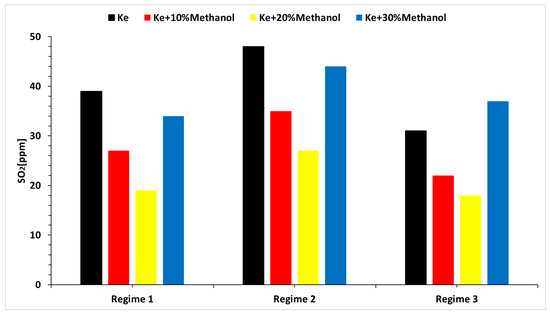 As for SO2 formation, its variation does not depend on alcohol concentration. Indeed, as compared to Ke alone, adding alcohol into the blend decreases the SO2 concentration. In terms of regimes, it seems that for Ke alone, max regime is the most efficient in terms of SO2 production since the burning temperatures are the highest, but for the blends consisting of added alcohol, the idle regime seems to be the most efficient, maybe due to the oxygen brought into reaction by the alcohol.
