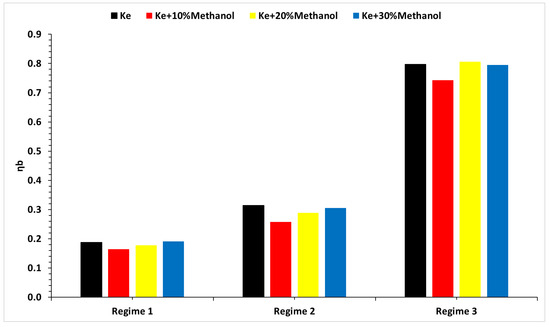 Upon analyzing Table 3, it becomes evident that the thermal efficiency values are notably low in comparison to those reported in the literature. This discrepancy is attributed to the distinct operating procedures of the turbo-engine under consideration, which differ from those employed in traditional airplane turbo-engines. Notably, the thermal efficiency is lower for the fuel blends than for Ke (kerosene) alone, and it demonstrates an increase with higher alcohol concentrations in the blends. This observation underscores the influence of fuel composition on the thermal efficiency of the turbo-engine, emphasizing the need for specific considerations and adjustments when assessing efficiency in non-standard engine configurations.