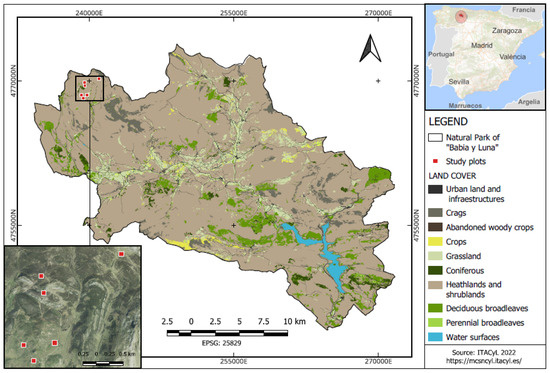 Map showing the location of the study area (Babia y Luna Natural Park) in Spain and the spatial distribution of the land use types within the park.