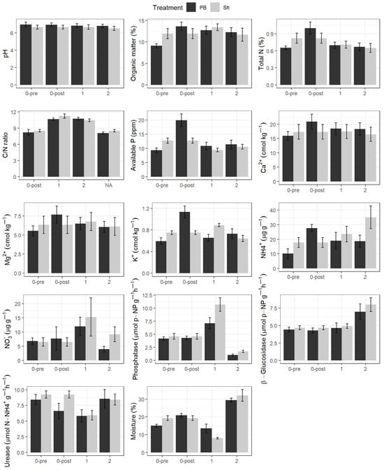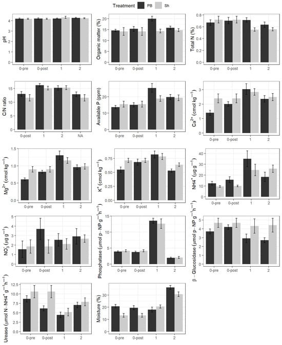 Changes in soil properties in gorse shrubland plots for the prescribed burning (PB) and shrub shredding (Sh) treatments: immediately before and after treatment (0-pre and 0-post, respectively) and one year (1) and two years (2) after treatment.