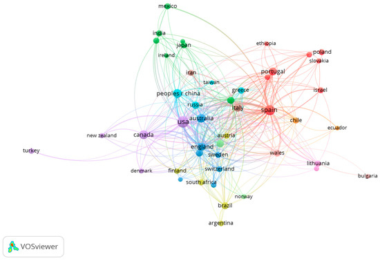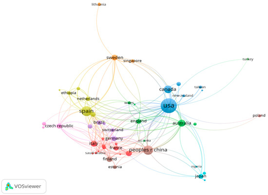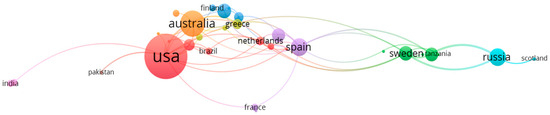 The number of publications from a country is taken as a measure to represent the degree of activity and contribution of that country in the research field [37,38]. Of the 1770 documents retrieved by the searches, 672 were from USA, followed by Spain (333), Italy (101), and Australia (41). The data were analyzed for national co-occurrence and summarized in a graph (Figure 2), which illustrates that the USA, Spain, England and Australia were most closely associated.