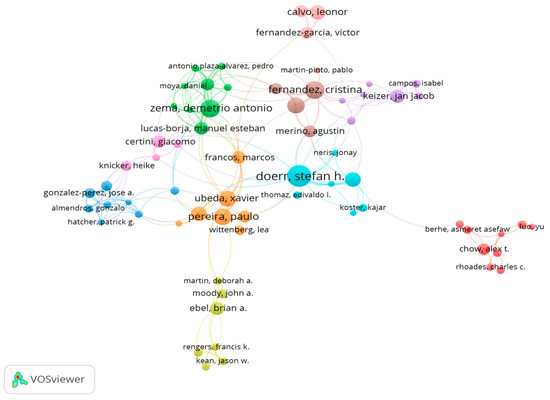 Co-occurrence analysis of the authors of published literature provides a good indication of the degree of importance of the core authors in a given research field, whereby different colors represent different groups of authors [39,40]. A graph representing these co-occurrence statistics for publications describing the effects of wildland fire on soil environment is shown in Figure 3. The top five authors in terms of number of publications were, in order, Stefan H. Doerr (Swansea Univ, Sch Environm and Soc, Dept Geog. Wales. 35 articles), Manuel Esteban Lucas-Borja (Univ Castilla La Mancha, Dept Agroforestry Technol and Sci and Genet, Sch Agr and Forestry Engn. Albacete. 35 articles), Jan Jacob Keizer (Univ Aveiro, Dept Environm. Aveiro. 30 articles), Paulo Pereira (Univ Barcelona, Dept Phys Geog and Reg Geog Anal, GRAM Mediterranean Environm Res Grp. Catalunya.; Mykolas Romeris Univ, Dept Environm Policy and Management. Vilnius.; Vilnius Gedminas Tech Univ, Environm Protect Dept. Vilnius. 22 articles) and Jorge Mataix-Solera (Univ Miguel Hernandez, Dept Agrochem and Environm, Environm Soil Sci Grp. Alicante. 21 articles) The distribution of authors is characterized by a small concentration and a large overall dispersion (Figure 3).
