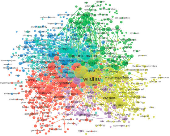 The 764 identified high-frequency keywords were analyzed for co-occurrence (Figure 4). The larger the circles in the figure, the more frequent that keyword appeared. Such keyword co-occurrence and cluster analysis can reveal hot topics and trends in a given research field, and evaluates the quality and impact of research results, whereby different colors represent different clusters [41,42]. From Figure 4, it can be seen that the keywords separate into six clusters (indicated by colors), indicating that, from 1998 to 2023, there were six important research topics in the field of the impact of wildfires on soil environment: “Wildfire”, “Organic matter”, “Vegetation”, “Black carbon”, “Climate Change” and “Burn severity”. The results indicate that the current focus is mainly on four aspects: (1) effects of fire on nutrient content, transformation and cycling in soils, and how soil fertility can be improved through fire management [43,44]; (2) the process of restoring ecosystems after fires, including revegetation, soil remediation and restoration of ecological functions [45]; (3) studies towards the effects of climate change on the frequency and intensity of fires and how fires in turn affect the climate system [46]; and (4) analyses of the impact of fire on soil erosion and water erosion and what measures can be taken to mitigate these problems [47].