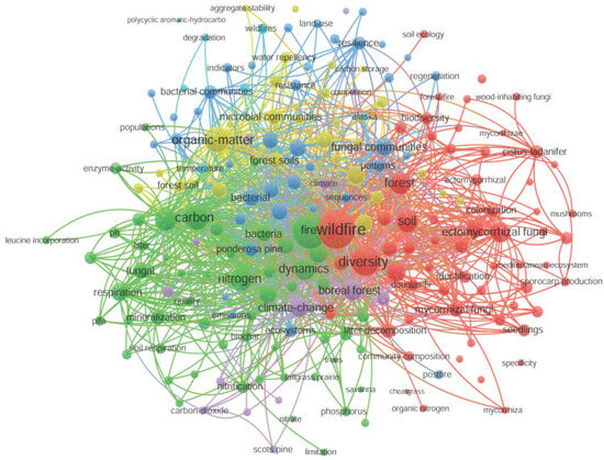 From Figure 8, it can be seen that the keywords co-occur in six clusters around the research topics “Wildfire”, “Fire”, “Boreal forest”, “Organic-matter”, “Temperature”, and “Fungal communities”. The focus of this literature was mainly on changes in the composition of soil microbial communities after fire, and their impact on soil ecosystem functioning, indicating in what processes soil microorganisms play a key role during the recovery of an ecosystem after fire [59,60].