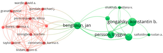 The most productive authors in this subject were Konstantin B. Gongalsky (Russian Acad Sci, AN Severtsov Inst Ecol and Evolut. Moscow. 8 articles), Andrey S. Zaitsev (Russian Acad Sci, AN Severtsov Inst Ecol and Evolut. Moscow.; Justus Liebig Univ, Inst Anim Ecol. Giessen. 6 articles), and Jan Bengtsson and Tryggve Persson (both from Swedish Univ Agr Sci, Dept Ecol. Uppsala. 4 articles). Clearly, authors from Sweden are over-represented in this list. The co-occurrence graph of authors (Figure 11) identifies two clusters, among which Bengtsson has the most correlations with other teams.