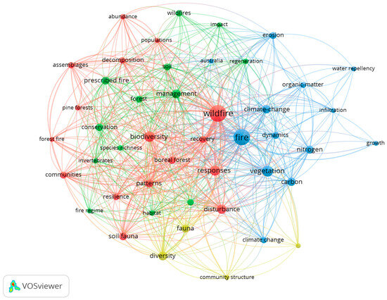 The co-occurrence analysis for keywords is shown in Figure 12, which contains four clusters, around “Wildfire”, “Fire”, “Management” and “Diversity”. These summarize the current focus of the available literature on the characteristics of soil animal diversity, spatial and temporal distribution of soil fauna, and individual density clustering of soil animal communities after wildfires. This underlines that soil animal communities are an important component of ecosystems, where they are a crucial part of the underground debris food network and, as such, soil animals are essential for the restoration and reconstruction of burned areas [68].