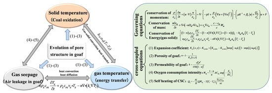 Equation (1) can describe the non-Darcy seepage process in goaf, Equation (3) can describe the gas transport process in goaf, and the coupling Equations (6) and (7) are used to describe the gas–solid energy transport in goaf. The coupling between them is achieved by modelling the evolution of goaf porosity, as shown in Figure 1.