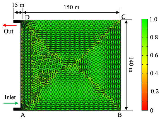 Combined with the results of previous studies [,,,], we established a multi-field coupled model of CSC in conformity with the 1302 working face. The activation energy of the CSC reaction was taken from the thermodynamic parameters of the Sample S1 in the literature [], and its approximate analysis is shown in Table 1 and used to determine the activation energy of the CSC reaction. The solid- and gas-phase parameters from the literature [] were used to determine the physicochemical parameters of the solids and gases. The initial boundary conditions and numerical simulation parameters are shown in Table 2 and Table 3, and the model grid is shown in Figure 2. For the numerical calculations, 5014 grid cells were set up and the grid was analyzed for skewness, where the closer the skewness to 1 represented the higher quality of the grid. As shown in Figure 2, the minimum mass of the grid cell is 0.5662 and the average mass is 0.913, so the grid quality of the model is relatively good. The calculation step was set to 2.4 h, and the simulated CSC time was 240 h, taking into account the calculation accuracy and computing cost.