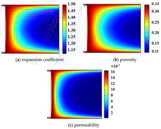 Setting a0 = 0.0368, a1 = 0.268, and dp = 0.04 m, the spatial distribution of the expansion coefficient, porosity and permeability of the goaf is obtained, as shown in Figure 3.