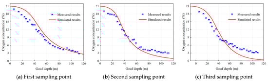 To further verify the accuracy of the numerical model, the distribution of oxygen concentration in goaf obtained from the simulation was compared with the measured data from the Yunhe Coal Mine, as shown in Figure 5. The gas collection is carried out through the pre-buried pipeline method in the Yunhe coal mine’s goaf, and the AD509 temperature measurement system and the beam pipe monitoring system are used as the means of on-site measurement and adopting the measurement method of distributing the points along the whole line of the tendency of the working face. Three sampling points were arranged, which were 35 m, 70 m and 105 m away from the down corner of the working face respectively. It can be seen that the simulation results are in good agreement with the measured results. Therefore, the numerical model can characterize the goaf CSC.