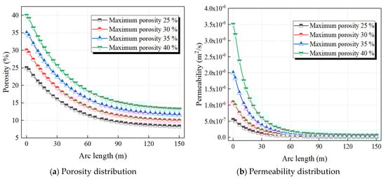 The impact of pore evolution on CSC characteristics in the goaf was studied by altering the pore distribution, with the maximum porosity set at 25%, 30%, 35%, and 40%. Taking the centerline of the goaf as the reference (75 m from the down corner), the distribution of the porosity and permeability of the cavitation zone with the depth of the goaf under different porosity is shown in Figure 6. For instance, the extraction zone’s maximum porosity is 25%, which gradually decreases to 8.27% with depth. The distribution of goaf pore with different porosity has a similar trend, and the lowest porosities corresponding to the highest porosities in the goaf of 30%, 35%, and 40% are 9.93%, 11.58%, and 13.24%, respectively. The permeability of the goaf is distributed spatially in a manner similar to the distribution of porosity. When the highest porosity is 25%, the permeability is highest near the working face side (5.48 × 10−7 m2/s), and then it decreases with increasing goaf depth, reaching a minimum of 1.33 × 10−8 m2/s. The goaf highest permeability corresponding to the highest porosity of 30%, 35%, and 40% is 1.09 × 10−6 m2/s, 2.00 × 10−6 m2/s, and 5.48 × 10−7 m2/s, respectively, and the corresponding lowest permeability is 2.38 × 10−8 m2/s, 3.95 × 10−8 m2/s, and 6.08 × 10−6 m2/s, respectively. In addition, the goaf permeability at different porosity varies near the working face (<60 m), indicating that the wind flow variations are more significant in this region.