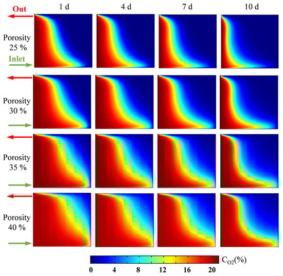 Spatial distribution of oxygen concentration with time for different goaf porosity.