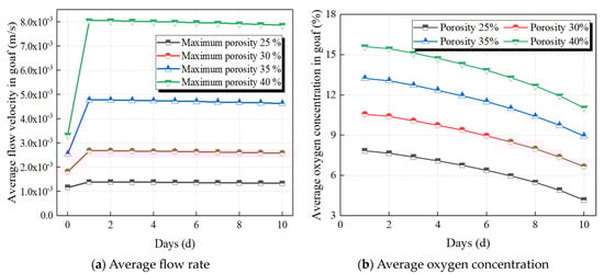 The variation of the average flow rate with goaf porosity is shown in Figure 8a. It can be seen that the average flow rate in the extraction zone remains stable with time. As the goaf porosity increases, the overall average flow rate changes significantly. When the highest goaf porosity is 25%, the average flow rate is between 0.00134 and 0.00139 m/s. The average flow rate with a goaf porosity of 30% is twice as high as that in the goaf porosity of 25%. Meanwhile, the increase in the average flow rate is more significant with further increase in goaf porosity; the average flow rate at the highest goaf porosity of 40% can reach up to 0.00806 m/s. It is evident that porosity greatly affects the airflow movement in goaf. Figure 8b shows the evolution of the average oxygen concentration with time e with different goaf porosity. The average oxygen concentration is strongly influenced by goaf porosity; the higher the goaf porosity, the higher the average oxygen concentration. The average oxygen concentration ranged from only 4.16% to 7.61% at 25% goaf porosity and from 11.04% to 15.62% at 40% goaf porosity. This is because, when the goaf porosity is low, the lower average flow rate makes the wind pressure difference inside smaller, resulting in insufficient oxygen that diffuses into the deeper part of the goaf. In addition, lower airflow velocities bring less oxygen to the goaf, which is not enough to sustain the CSC process. When the goaf porosity increases, the airflow velocity and oxygen concentration increase significantly, which promotes the CSC reaction. Overall, the increased goaf porosity results in a significant increase in flow rate and oxygen concentration, while the oxygen consumed by CSC is much lower than that produced by air leakage. Therefore, the higher the goaf porosity, the higher the average flow rate and average oxygen concentration.