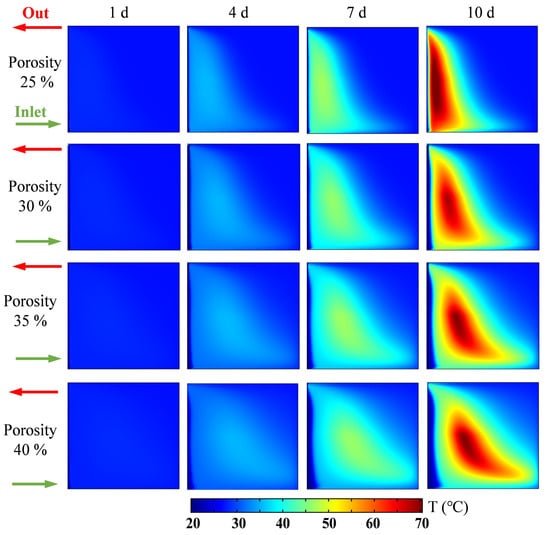 Figure 9 shows the spatial distribution of temperature with time with different goaf porosity. It can be seen that variations in porosity can directly affect the CSC process. When the goaf porosity is low, less oxygen leaks into the mining area and is transported more slowly, and most of the oxygen mainly accumulates on the side of the mining region near the working face. Over passes, the coal rock near the working face reacts with oxygen, causing a rapidly increased temperature in the region. The temperature then gradually decreases along the deeper part of the goaf. As the goaf porosity increases, it provides sufficient oxygen for CSC. When the oxygen consumption of CSC is saturated, the coal rock near the high-temperature region will also heat up rapidly and spontaneously combust, thus there is a phenomenon in which the high-temperature region migrates to the deeper part of the goaf. When the porosity is 25%, the overall goaf temperature slightly increases with time before the 7th day, and then the temperature increases significantly. This is due to the fact that, during the 1st to 4th day, the leakage brought fresh airflow to the goaf, and the coal rock gradually stored heat and the overall temperature increased slightly. Over time, heat storage in the coal rock intensified and CSC began to occur on the near-leakage side, thus increasing the temperature substantially. The trend in temperature variations with different goaf porosity is similar, and the range of the high-temperature region gradually increases along the goaf depth as the porosity increases. Consequently, the higher the goaf porosity, the higher its overall temperature.