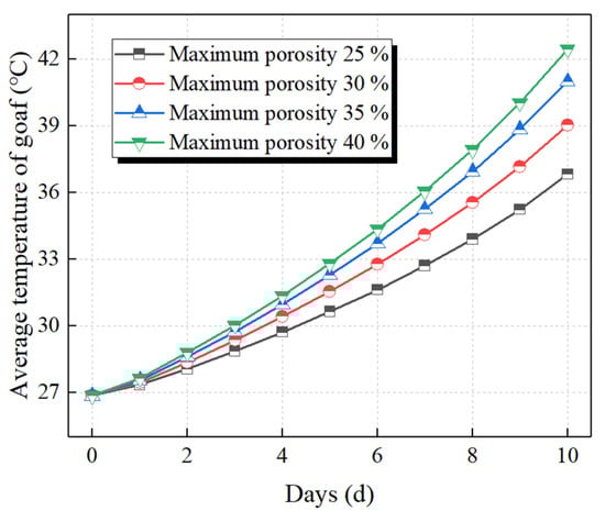 Figure 10 displays the relationship between average temperature and goaf porosity over time. The data indicates that, as goaf porosity increases, so does the average temperature. The goaf average temperature was 26.85–36.83 °C at 25% porosity and 26.85–42.465 °C at 40% porosity. When the goaf porosity is 25%, the average temperature is 26.85–36.83 °C, and, when the porosity is 40%, the average temperature of the goaf is 26.85–42.465 °C. This is because the increase in goaf porosity allows a significant increase in the oxygen concentration, which accelerates the CSC process. It follows that the higher the goaf porosity, the higher the average temperature.
