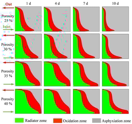 Figure 11 shows the spatial variation of CSC three zone with time for different goaf porosity. When the goaf porosity is low, oxygen mainly accumulates on the side near the working face, and the CSC reaction consumes a large amount of oxygen, leading to the reduction in overall oxygen concentration, thus the range of radiator zone and asphyxiation zone decreases with time. With the rise in goaf porosity, the overall oxygen concentration increases, and the oxygen consumption rate by CSC is smaller than the amount of oxygen from air leakage; over time, even though the oxygen concentration decreases, it can still be maintained at a high level. As a result, the high porosity goaf has significantly higher regions of radiator and oxidation zones than the low porosity goaf. At a goaf porosity of 25%, the range of both the radiator and oxidation zones decreases with time, while the asphyxiation zone increases. The variation trend in the three zones with different goaf porosity are similar, with the three zones ranges showing a trend of low radiator and oxidation zones and higher asphyxiation zone over time. The higher the goaf porosity, the greater the range of the three zones.