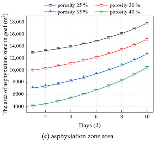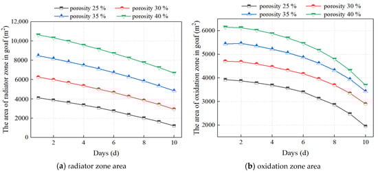 The calculation of the CSC three zones’ area can be performed through the integration method, as shown in Figure 12. It is evident that the porosity has a significant impact on the area of the three zones. For instance, when the goaf porosity is 25%, the radiator and oxidation zones’ area decrease with time from 4105.75 m2 and 3928.24 m2 to 1200.41 m2 and 1951.11 m2, respectively. In contrast, the asphyxiation zone’s area increases with time from 12,951.10 m2 to 17,817.64 m2. The oxidation zone is the region where CSC occurs frequently and is the focus of much scholarly attention. When the goaf porosity is 25%, the variation in the oxidation zone area with time ranges from 1951.11 m2 to 3928.24 m2 only, whereas when the goaf porosity is 40%, the variation in the oxidation zone area with time ranges from 3699.07 m2 to 6156.88 m2. It can be seen that the higher the goaf porosity, the higher the oxidation zone area and the higher the CSC risk.