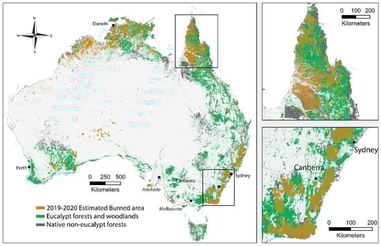Distribution of native eucalypt forests and woodlands in Australia (green), and the calculated extent of different fires between September 2019 and June 2020 (brown), including prescribed and low-intensity fires. Insets show regions where large areas of native eucalypt forests and woodlands burned during the 2019–2020 fire season. Sources: distribution of eucalypts [20], burned extent [28].