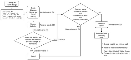 Duplicate results were removed using a reference manager, and we eliminated documents unrelated to leaf-level flammability traits. Afterwards, we uploaded the final 103 documents to Sysrev [34] for information extraction. We reviewed the title, abstract, and keywords of each article and applied the following two criteria for inclusion or exclusion: (1) the document had to relate at least one of the flammability components to at least one leaf-level trait, and (2) the document had to involve at least one eucalypt species in the analysis of flammability. The remaining documents (n = 76) were further analysed and 56 of them were declared ineligible (Figure 2), leaving 20 to be included in this review. We used Sysrev to manually extract preliminary information from each document before a full document review (see Supplementary Table S1). We then reviewed each document and grouped the leaf-level traits into five categories: water-related traits, physical traits, VOCs, structural carbohydrates, and other traits.