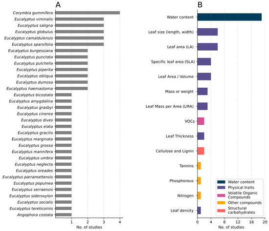 Of the 20 peer-reviewed documents which reported the relationships between flammability and leaf-level traits in eucalypt forests, most studies (70%) were from Australia (n = 14), and 70% of the studies were published after 2010 (Supplementary Figure S1). Overall, 35 species of eucalypts were assessed in the flammability studies, but Corymbia gummifera (Gaertn.) K.D.Hill & L.A.S.Johnson, Eucalyptus camaldulensis Dehnh., E. globulus Labill., E. sparsifolia Blakely, E. saligna Sm, and E. viminalis Labill. were the most used for flammability experiments (Figure 3A). C. gummifera and E. saligna were included in most of the studies focusing on Australian vegetation, while E. globulus, E. camaldulensis, and E. viminalis, which are commonly used for plantations, appeared in documents from Australia and Chile, Spain and Greece, and Australia and New Zealand, respectively.