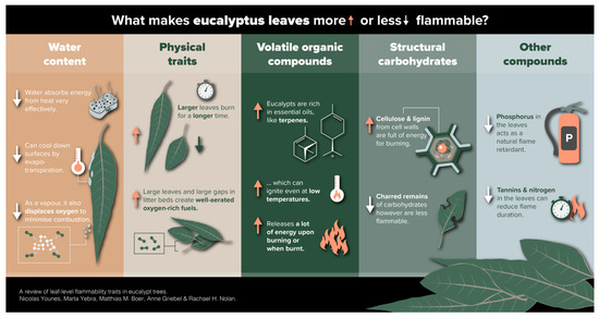 This review aims to (1) synthesise the existing literature on leaf-level traits that influence the flammability of eucalypt species, (2) understand how and why these traits change the flammability at the leaf level, and (3) identify priorities for future research. Through compiling available information on how flammability relates to leaf-level traits, this review will guide methods for targeted monitoring of forest fuels and their flammability status, including the design of future technologies targeting forest flammability across Australia and other regions where eucalypts are abundant.
