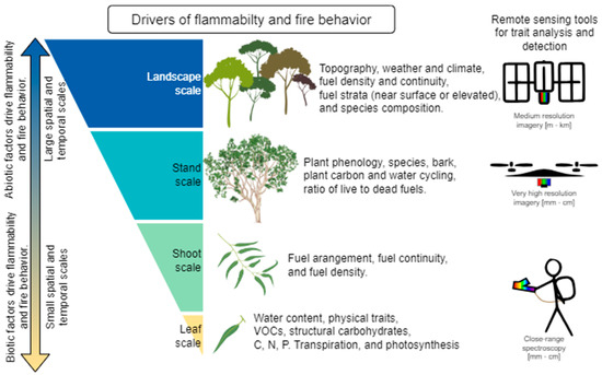 Drivers of flammability and fire behaviour and spread depend on the spatial and temporal scale of assessment. Remote sensing tools to monitor vegetation also change with scale.