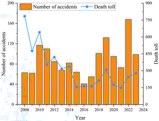 China’s energy system is notably characterized by an abundance of coal resources and a relative scarcity of petroleum resources. Coal occupies a vital position as the cornerstone of national energy [,,,]. Due to the complex and changeable geological conditions of coal seams in our country, the safety production of coal mines is faced with severe challenges, so various disasters occur frequently. Among them, the spontaneous combustion of coal (SCC) is particularly concerning because of the seriousness of its potential hazards, the difficulty of prevention and control, and the far-reaching impact on resources and the environment [,]. Figure 1 shows the trend of the incidence and death toll of coal mine fire accidents in China from 2008 to 2023. Although, in recent years, China’s supervision and management of coal mine safety production has been continuously strengthened, which has led to a significant decrease in the incidence rate and death rate of coal mine accidents. However, due to the huge coal production, wide distribution of mines, complex mining conditions, and differences in various levels, mine fire prevention and control (MFPC) work is still facing a severe situation [].