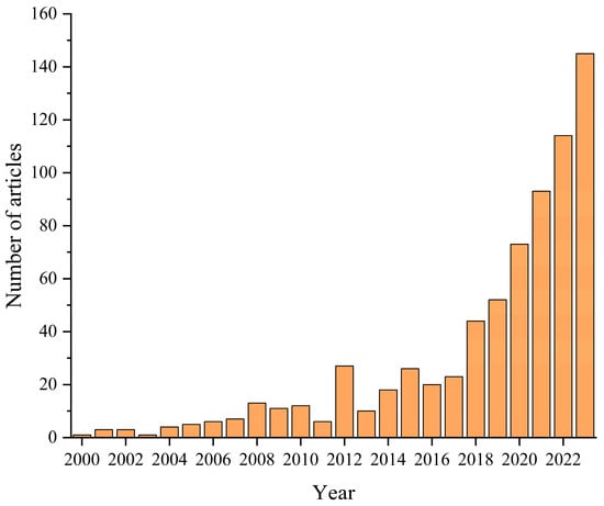 As a quantitative index, the number of studies can reveal the degree of academic activity and its development in a certain subject field to some extent. It directly reflects the accumulation of research results of related disciplines and the active situation of knowledge innovation. Figure 2 shows the number of publications in the direction of MFPC from 2000 to 2023. According to the change trend of MFPC’s annual publication volume, it can be divided into the following three stages: the initial period and the exploration period (2000–2008), and the average number of MFPC papers in this stage is only four per year. This may be due to the fact that the field was still in its infancy during this period, and researchers were exploring new methods and technologies to prevent and control mine fires [,,,]. In addition, technologies such as the Internet and social media were not yet widespread during this period, so the dissemination of articles was limited. The period of steady growth (2009–2019) was an important phase in the global MFPC research journey, which lasted for a decade, and the annual publication volume in the field showed a continuous and steady increase, with an average of about 25 academic articles published each year [,,,,]. During the explosive growth period (2020 to 2023), the average number of papers published in the direction of MFPC in this stage is 107 per year, and the number of papers has surged [,,,,,,,]. The main reason is that the research in MFPC field continues to deepen, resulting in an increasing number of fruitful results accumulated by researchers, which not only build a solid foundation for subsequent research but also indicate the direction of research. The increasing number of publications each year clearly indicates that MFPC is receiving unprecedented attention, indicating that the field is about to enter a new stage of development.