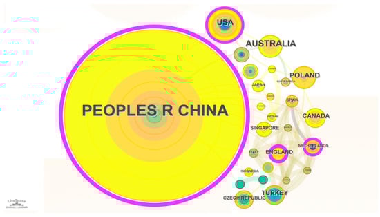 We used CiteSpace to create a knowledge map for country/region cooperation analysis to identify the major countries in the MFPC space and their partnerships, as shown in Figure 3. It was observed that as many as 36 countries participated in the MFPC study. The top three countries were China, with a total of 642 publications (89.54%), the United States, with 27 publications (3.77%), and Australia, with 21 publications (2.93%). Each node in Figure 3 represents a different country, and the number of articles for each country is represented by the size of the node. The colors of the nodes and the thicknesses of the lines carry specific meanings. The darker the center color of the node, the earlier the research in this field was carried out. The lighter the external color of the node, the more active the MFPC research has been in the country/region in recent years. These nodes are connected to each other by wires, which graphically show the cooperative links between different geographical areas. The thickness of the connection can directly reflect the closeness of cooperation and interaction between countries and regions. The thicker the line between the two nodes, the closer the connection between the two countries. On the other hand, the smaller the connection, the weaker the cooperation between the two countries. When a node is surrounded by a pink circle, it means that the node has a large centrality and plays an important role in the network. It is clear that European countries cooperate more closely with each other than in any other part of the world. China has close cooperation with Australia, Canada, and the United States. Among these, China, the United States, England, and other countries have an important role in the research of MFPC field in the whole national network. In order to further promote this field to a higher stage of development, China, Canada, and the United States, which are rich in global scientific research output, need to strengthen the deep cooperation and collaborative innovation among the three countries. The United States, China, and some European countries started MFPC research earlier, and in recent years, China, the United States, and Canada mainly have been committed to MFPC research.