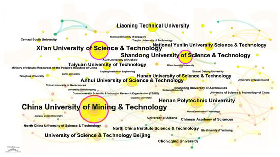 In order to identify the most productive institutions in the MFPC field and the collaborations between them, an analysis of research institutions and inter-institutional collaborations is provided []. CiteSpace-related parameters are determined to generate a research institution collaboration graph with 247 nodes and 318 connectivity lines, as shown in Figure 4. The level of research output of the institutions is visually displayed by the node size, and the connections between the nodes depict the closeness of cooperation between the research institutions. As can be seen in Figure 4, in the MFPC field, six universities, including the China University of Mining and Technology (CUMT), Xi’an University of Science and Technology (XUST), Shandong University of Science and Technology (SDUST), Henan Polytechnic University (HPU), Anhui University of Science and Technology (AUST), and University of Science and Technology of Beijing (USTB), by virtue of their remarkable achievements in related scientific research output, are firmly in the forefront of all research institutions, which is specifically reflected in the number of papers ranked in the top six. CUMT, XUST, and SDUST play an important role in the whole network of research institutions. Among these, CUMT has established close cooperation with more than 20 research institutions. Examples include SDUST, USTB, HPU, the Chinese Academy of Sciences, Hunan University of Science and Technology, Pennsylvania State University-University Park, Curtin University, West Virginia University, the Commonwealth Scientific and Industrial Research Organisation (CSIRO), the Pennsylvania Commonwealth System of Higher Education (PCSHE), and the Czech Academy of Sciences. This research reveals that the cooperation between academic institutions presents obvious regional characteristics, that is, the cooperation behavior mostly occurs between institutions in similar geographical locations or in the same region, forming a relatively dense regional collaboration network. In contrast, cross-border or even intercontinental cooperation is rare. This phenomenon shows that despite the increasing attention paid to international scientific research cooperation under the trend of globalization, in practice, academic institutions still tend to give priority to geographical proximity and convenience of resource sharing within a region when choosing partners, resulting in transnational and trans-continental cooperation being less frequent than intra-regional cooperation. Of course, this does not mean that research cooperation between countries or continents cannot be achieved, but in the existing research cooperation models, it has not yet become the mainstream and needs to be further promoted and developed.