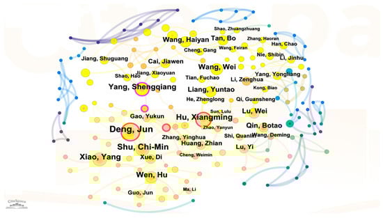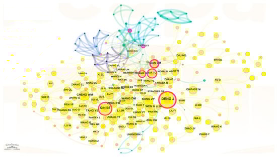 As can be seen in Figure 5, in the lower left is a cooperative network composed of Deng Jun, Shu Chimin, and Bai Zujin [,,,,]. One of them, Deng Jun, is also closely associated with Yang Shengqiang of CUMT. In the middle section is a collaborative network consisting of Hu Xiangming, Lu Wei, Huang Zhian, Xue Di, and Liang Yuntao [,,,,,,,]. In the bottom right is a collaborative network consisting of Wang Deming, Qin Botao, Shi Quanlin, and Wang Wei [,,,,]. Among them, Wang Deming first proposed a new type of prevention and control technology, three-phase foam, in 2004. In the top left, is a collaborative network consisting of Yang Shengqiang and Zhou Buzhuang, among others [,,,,]. In the upper right center, is a collaborative network consisting of Tan Bo, Wang Haiyan, Niu Huiyong, and Shao Zhuangzhuang [,,,,,,,,]. On the right is a collaborative network consisting of Li Zenghua and Kong Biao et al. [,,]. According to the author cooperation map, most of the MFPC researchers are from CUMT, XUST, HPU, SDUST, and the China University of Mining and Technology (Beijing). In addition, the author’s institutions show significant geographical proximity and particularly close cooperation with each other, which indirectly confirms the large number of scholars in the MFPC field, but the research activities show obvious fragmentation characteristics, lacking large-scale and organized collaborative research and knowledge exchange. In the development of the MFPC field, in-depth academic exchanges and cooperation among leading scholars have played a decisive role in promoting the progress of the entire discipline. In view of this, it is urgent to take measures to strengthen the cooperation and communication among researchers in the MFPC field to promote resource integration and knowledge sharing.