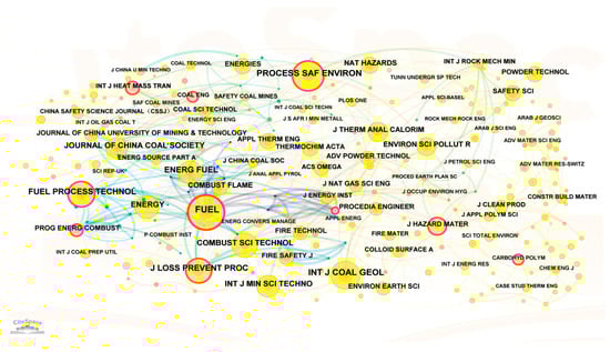 Among journal co-citations, Fuel, the International Journal of Coal Geology, Process Safety and Environmental Protection, the Journal of Loss Prevention in the Process Industries, and Fuel Processing Technology are frequently cited. In terms of co-citation, Fuel ranked first, with 519, the International Journal of Coal Geology ranked second, with 358, and Process Safety and Environmental Protection ranked third, with 349. Among these, Fuel and Process Safety and Environmental Protection play a key role in both average citation and co-citation. In general, the ten journals listed in the table are all prestigious academic publishing platforms around the world, and they have high profiles and influence in the MFPC research field. These include Fuel, Energy, Process Safety and Environmental Protection, and Combustion Science and Technology. These journals play a key role in mine fire control research.