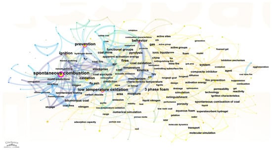 As can be seen in the figure, spontaneous combustion and low-temperature oxidation are the core keywords; their significant network center status and extensive connectivity highlight their critical role in the field of mine fire research. This not only reflects the deep concern of the scientific research community for SCC processes, especially oxidation reactions occurring at low temperatures, but also reveals the seriousness of these processes as potential causes of mine fire accidents, so it has become the focus of research by researchers. At the same time, the high frequency of the keywords prevention and behavior and their close correlation with many other keywords further reveal the focus of the research. The strong correlation of prevention with words such as fire agent, inhibition mechanism, and design indicates how to effectively prevent the development of fire sources through scientific design and the selection of appropriate fire extinguishing agents and inhibition mechanisms in MFPC research. It became the key technology strategy of MFPC. This highlights the central role of preventive measures in reducing mine fire risk. On the other hand, the close connection between the keywords behavior and oxidation, temperature, and model predictions reveals researchers’ great concern for the characteristics of mine fire behavior and how to use models to predict their dynamic changes. This indicates that researchers are committed to studying the interaction between the physical and chemical behavior of fire and environmental variables in order to more accurately predict the development trend of fire, and then formulate more targeted prevention and control strategies. In addition, the keywords 3 phase foam, gas, ionic liquid, and gel in the map are closely related to the above important concepts, reflecting the cutting-edge trend of MFPC field in technical applications. These advanced technologies not only play an important role in physical, chemical, or physicochemical inhibition strategies but they are directly related to the solution of core problems such as spontaneous combustion, low-temperature oxidation, prevention, oxidation, and behavior. This shows the deep integration of theory and practice. In summary, this analysis not only reveals the focus of mine fire prevention and control research, such as spontaneous combustion and low-temperature oxidation mechanism, but also emphasizes the necessity of prevention measures and fire behavior research and shows the development of key technologies in the MFPC field, providing clear directional guidance and potential innovation points for subsequent research.