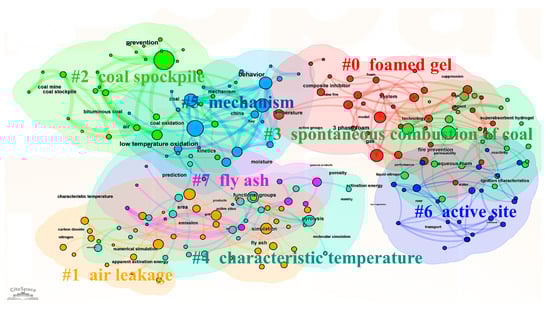 Thirty-three clusters were obtained from the 290 keyword extractions, and the clusters with less than ten clusters were filtered by CiteSpace’s built-in filtering function. Figure 9 shows the main clusters in this paper, according to # 0, # 1……# 7 sort. In the MFPC field, the CiteSpace analysis map reveals the research on the inhibition effect of different control technologies on various types of coal under different storage methods, states, and external environments. According to the unique properties of different coal, especially the characteristic temperature and the formation of signature gas during spontaneous combustion, the effects of various inhibition techniques are evaluated. In recent years, blocking mechanism and gel foam have become hot topics and have widely drawn the attention of academia and industry, and many scholars have focused their research on the blocking mechanism of anti-fire gels [,,,,]. The rapid development of computer technology and software technology is promoting the progress of scientific research with unprecedented efforts, especially in the field of MFPC; the numerical simulation of various inhibition technologies has gradually emerged and become the focus of academic and industrial attention [,,,,,,,]. This kind of research mainly discusses how various materials affect the active site of SCC at the molecular level. In short, the research in the MFPC field is deepening, and new prevention and control technologies and evaluation systems are gradually taking shape, which will further promote scientific and technological progress and development in this field.