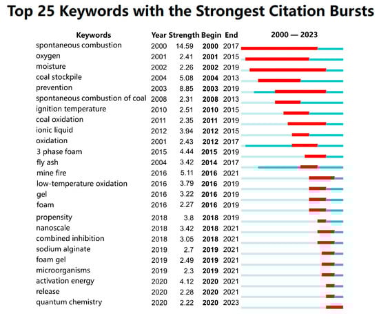 As can be seen in the figure, spontaneous combustion ranks first, with a significant outburst intensity value of 14.59, which indicates the deep concern about the spontaneous combustion mechanism of coal and its prevention and control strategies in this field. Prevention followed, with a strength of 8.85, underscoring the centrality of prevention measures in mine fire prevention and the emphasis placed on highly effective inhibitors and suppression mechanisms. The intensity values of mine fire and coal stockpile are 5.11 and 5.08, respectively, which suggests that researchers should consider fire risk control in specific application scenarios, especially the safety management of open coal stockpile, a fire-prone area. The high breakout strength of three-phase foam and release (4.44 and 4.12, respectively) reflects the rise of innovative retarding technologies, particularly those that can release retarding ingredients in a timely manner to enhance flame retardancy. It is worth noting that the discovery of activation energy and quantum chemistry marks a change in research perspective, that is, from the traditional macroscopic analysis to the in-depth exploration of the microscopic mechanism of coal spontaneous combustion. This is closely related to the popularity of molecular simulation software, which enables researchers to explore in more detail how different inhibitors affect the oxidation reaction path and activation site of coal at the molecular level, thus promoting the development of physicochemical synergistic inhibition methods. The decline of moisture and ignition temperature means that the research on the basic physical properties of coal has become mature, and the rise of new keywords, such as release and quantum chemistry, indicates that MFPC research is entering a new stage of development. It focuses on deeper theoretical understanding and technological innovation. In summary, the emergence and change in these keywords not only reveal the shift of research hotspots in the MFPC field but also provide clues for future research directions, namely, strengthening the exploration of the inhibition mechanism at the microscopic level, developing intelligent responsive inhibition materials, and optimizing the design and application of inhibitors using advanced computational techniques. This map provides valuable visual evidence for understanding the evolution of knowledge structures in the MFPC field, facilitating cross-disciplinary exchanges and collaboration, and providing new ideas for addressing complex scientific challenges.