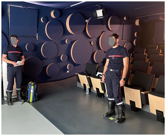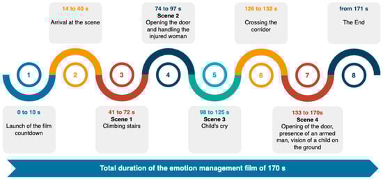 One of the objectives of the CP2DIMG research program is to examine the effect of emotions on decision-making in a professional setting among firefighters and police officers. Their abilities to manage and regulate emotions in an operational context recreated for the study were assessed in a first series of tests. Immersive technologies are relied upon to recreate a professional scenario in the form of a serious game [63]. The objective is to closely replicate the emotional aspect of the operational context. The immersive multi-sensory experience is the chosen technology, which combines a set of visual and auditory stimuli to create an experience that engages multiple senses. These technologies offer interesting potential in learning or teaching, as described by Morgado [64]. To come as close as possible to real-life intervention conditions, the proposed experimental protocol relies on four previously described criteria: rapid evolution, uncertainty, high risk for the interveners, and the obligation to act to save. Thus, the objective of this first film is to place individuals under extreme stress (taking them out of their comfort zone) or intense emotional peaks. It is worth noting that the scenario of this “general public” film was deliberately designed to evoke emotions for firefighters, police officers, as well as individuals not part of the emergency services in a context very different from that of high-intensity fire evacuation, but still within an operational context (Figure 1). The editing of the emotional induction film was designed to immerse participants in a realistic and dynamic scenario, representative of fire brigade interventions, and adhering to operational context criteria. The chosen scenario incorporates these criteria, emphasizing the necessity for rescue. The timeline identifies key elements observed, forming a temporal sequence that aims to create emotional peaks associated with the context. These peaks are driven by uncertainty, risks to individuals or responders, sudden changes in exercise conditions, or the urgency of rescue operations. Scenarios tailored for firefighters and police officers, considering specific operational contexts, are currently being designed and will be implemented during the second year of the project (2024–2025).