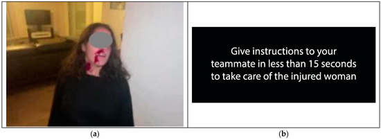 (a) Image from the movie (scene 2) where a character is injured. (b) Question n°1 inserted into the film and posed to the participants: “Give instructions to your teammate in less than 15 s to take care of the injured woman”.
