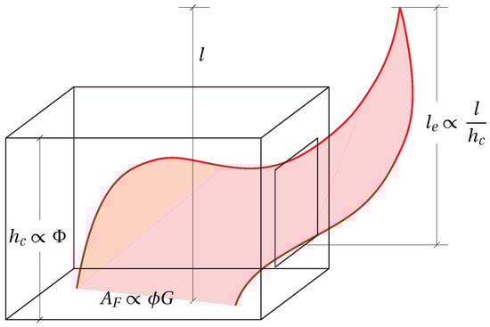 - Determination of the -factor: This ultimately depends on the model’s flame length (l) in relation to the compartment height (). In turn, the flame length depends only on (ventilation, i.e., window height and area) when falling within Regime I fires, or on the effective fuel load density () (specific area of exposed fuel, i.e., type and arrangement of fuel, and total fuel load) when falling within Regime II fires.