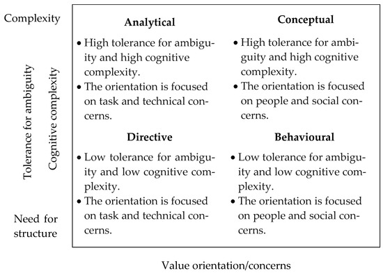 Azeska et al. [82] identified in their studies that leaders with a directive decision-making style are associated with the directive leadership style. The leader makes decisions based on a relatively small amount of information and lacks tolerance for vague information; leaders with an analytical decision-making style make decisions by researching extensive data and have an increased tolerance for vague information; leaders with a conceptual decision-making style make decisions based on extensive elaboration of data and tend to be creative and inventive; leaders with a behavioral decision-making style are characterized by an exaggerated need for acceptance (affiliation) and a participative leadership style with team members.