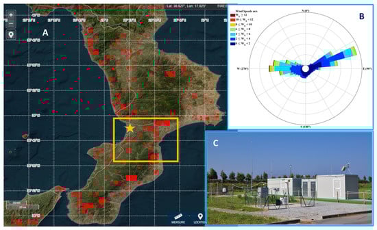 Of particular interest is the position of the experimental site within the geodynamic framework of the Calabria–Peloritani Arc, due to its location in the narrowest area within the trough that connects the Ionian and Tyrrhenian seas, which is also the narrowest area in the entire country. The area is characterized by local moderate wind breezes, converging on the Marcellinara gap between the two seas (orange box Figure 1). The sea breeze is well developed during daytime hours, when the wind flows from the west to the east, while the flow is reversed during the night-time period due to land breezes. The predominant synoptic circulation overlap with local breezes preserves a strong directionality from the west (Figure 1) [,].