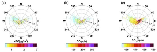 Bivariate analyses: hourly mean values of eBC (a), CO (b) and CO2 (c) as a function of wind speed and direction for summer 2017–2021.