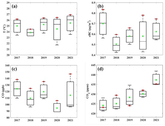 For each year between 2017 and 2021, we report the average summer season values (green spots), the mean values for August months (red spots), the median (bold lines) and the 5th, 25th, 75th and 95th percentiles (box and whiskers) for air temperature (a), eBC (b), CO (c) and CO2 (d).