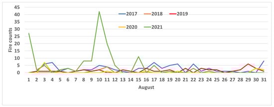 Time series reporting the number of August daily active fires detected by GFED4 (MODIS satellite) in the study area (see Figure 1) for years 2017–2021. The y-axis shows the number of fires in the selected area.