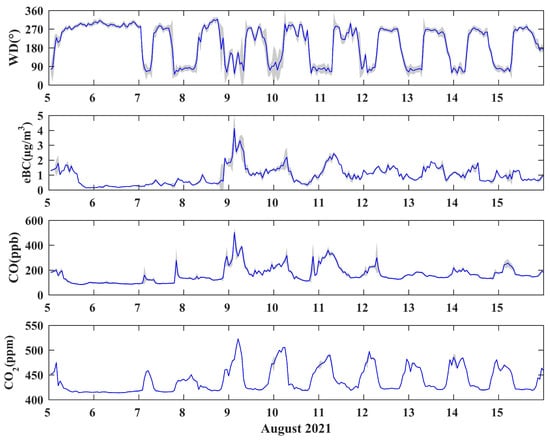 The time series of hourly mean values with respective standard deviations (grey shadow) for the period from 5 to 15 August 2021 for wind direction, concentrations of eBC, CO, and CO2 observed at LMT.