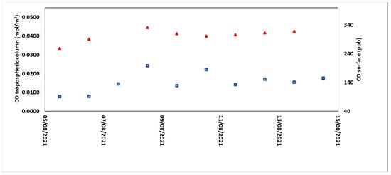 Comparison between near-surface CO values (blue squares) at LMT observed at 01:00 p.m. UTC and tropospheric column in molecules/m2 (red triangles) by TROPOMI L2 product. The considered period ranges from 5 to 15 August 2021.