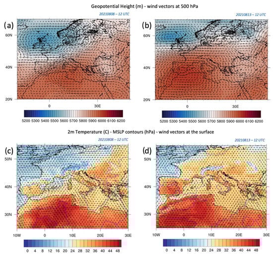 NCEP-GFS Geopotential Height (m) and wind vectors at 500 hPa, for 8 August 2021 at 12:00 a.m. UTC (a) and 13 August 2021 at 12:00 a.m. UTC (b). NCEP-GFS 2 m temperature (°C), Mean Sea Level Pressure, MSLP (hPa) and wind vectors at the surface for 8 August 2021 at 12:00 a.m. UTC (c) and 13 August 2021 at 12:00 a.m. UTC (d).
