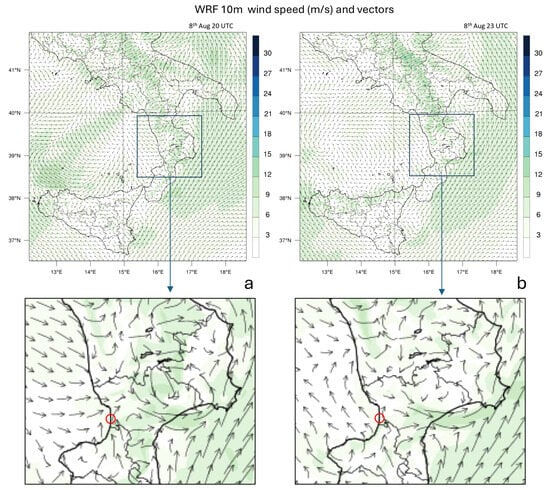 Synoptic features were analyzed using the NCEP-GFS data (0.25-degree horizontal resolution), the same as those adopted for the WRF initial and boundary conditions. The analysis revealed (related maps are reported in Figure 7) a stationary synoptic configuration for the whole period, with general atmospheric stability conditions. On 8 August, a wide upper-level (500 hPa) ridge dominated the whole Mediterranean Basin, with a high pressure area between Northern Africa and Southern Italy (upper panels of Figure 7). This configuration persisted for the whole period, only slowly moving westward in the next days (the upper-level high-pressure area was in fact located over the Strait of Gibraltar on 13 August as shown in Figure 7). Zonal upper-level flows approached the Mediterranean and a cyclonic circulation affected Southern Italy. At the surface, a leveled-pressure regime prevailed, with weak winds with cyclonic rotation over Southern Italy, predominantly from the south over the central areas of Calabria (bottom panels of Figure 7). To better assess the local circulation over the study area, we report in Figure 8 the 10 m wind speed and direction (vectors) simulated by the high-resolution (2 km) WRF model in the initial phases of fire events, in particular immediately before (08:00 p.m. UTC on 8 August) and after (11:00 p.m. UTC on 8 August) the increase in all parameters described in Figure 5 in LMT.