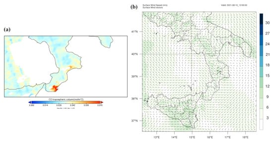 Identification of fires occurrence at Aspromonte Massif site via CO concentration by using satellite data (a) and wind circulation (b) from WRF output map on 10 August 2021.