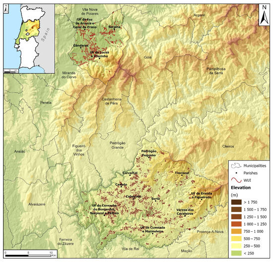 Location, elevation, and wildland–urban interfaces (WUIs) of the municipalities of Lousã and Sertã.