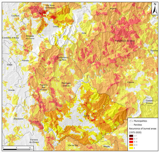Recurrence of forest fires (1975 and 2020). (Data source: Portuguese National Authority for Nature Conservation, 2021).